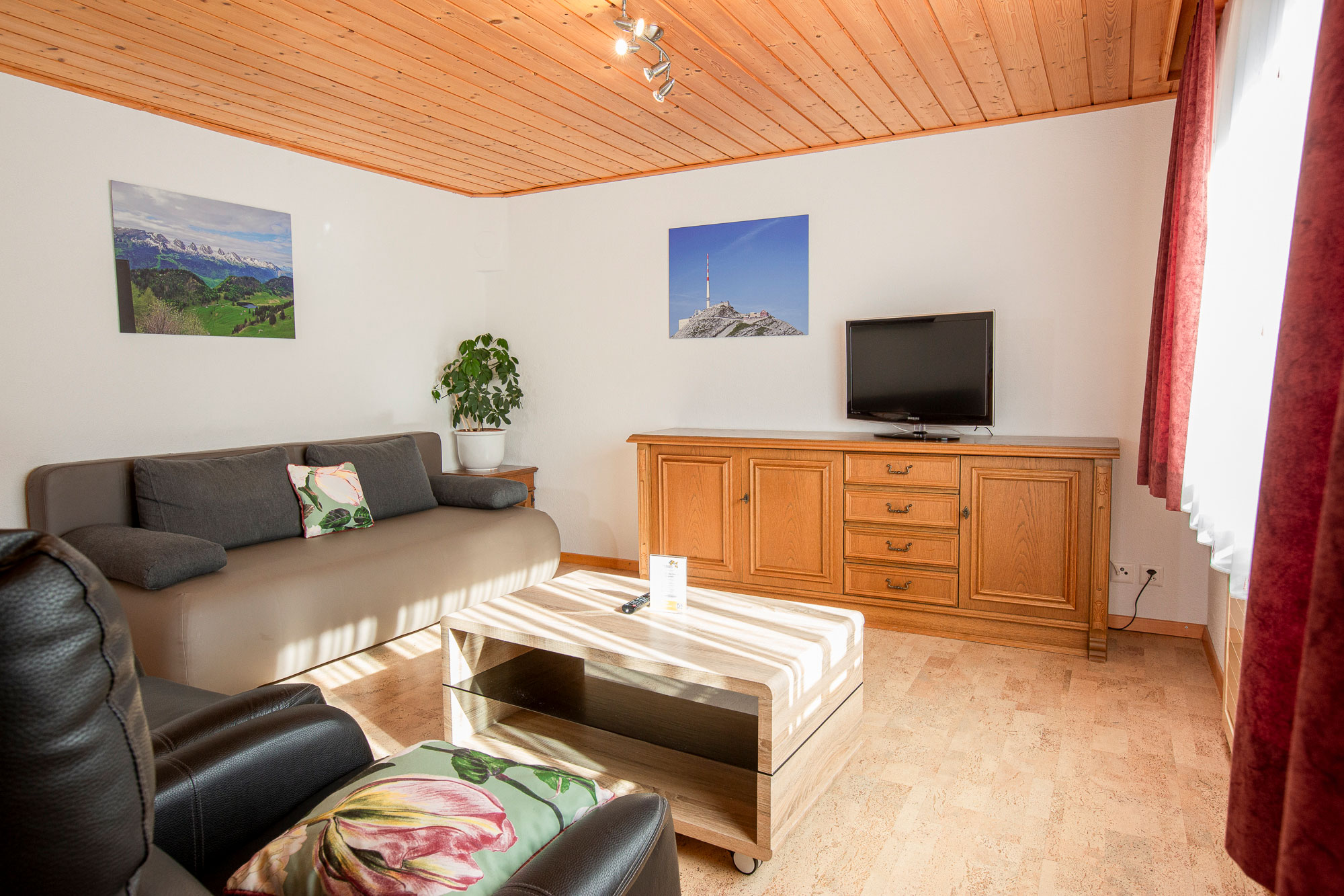 Freundliches, rustikal möbliertes 60m2 grosses Appartement mit Küche, optisch getrenntem Wohnteil mit Couch und Sesseln, Essecke, Panoramabalkon mit Blick zu den Churfirsten, 1 Schlafzimmer mit Doppelbett, 2. Schlafzimmer im Obergeschoss mit 3 Einzelbetten. Badezimmer mit Dusche, WC, Haarföhn und Beautyprodukten.