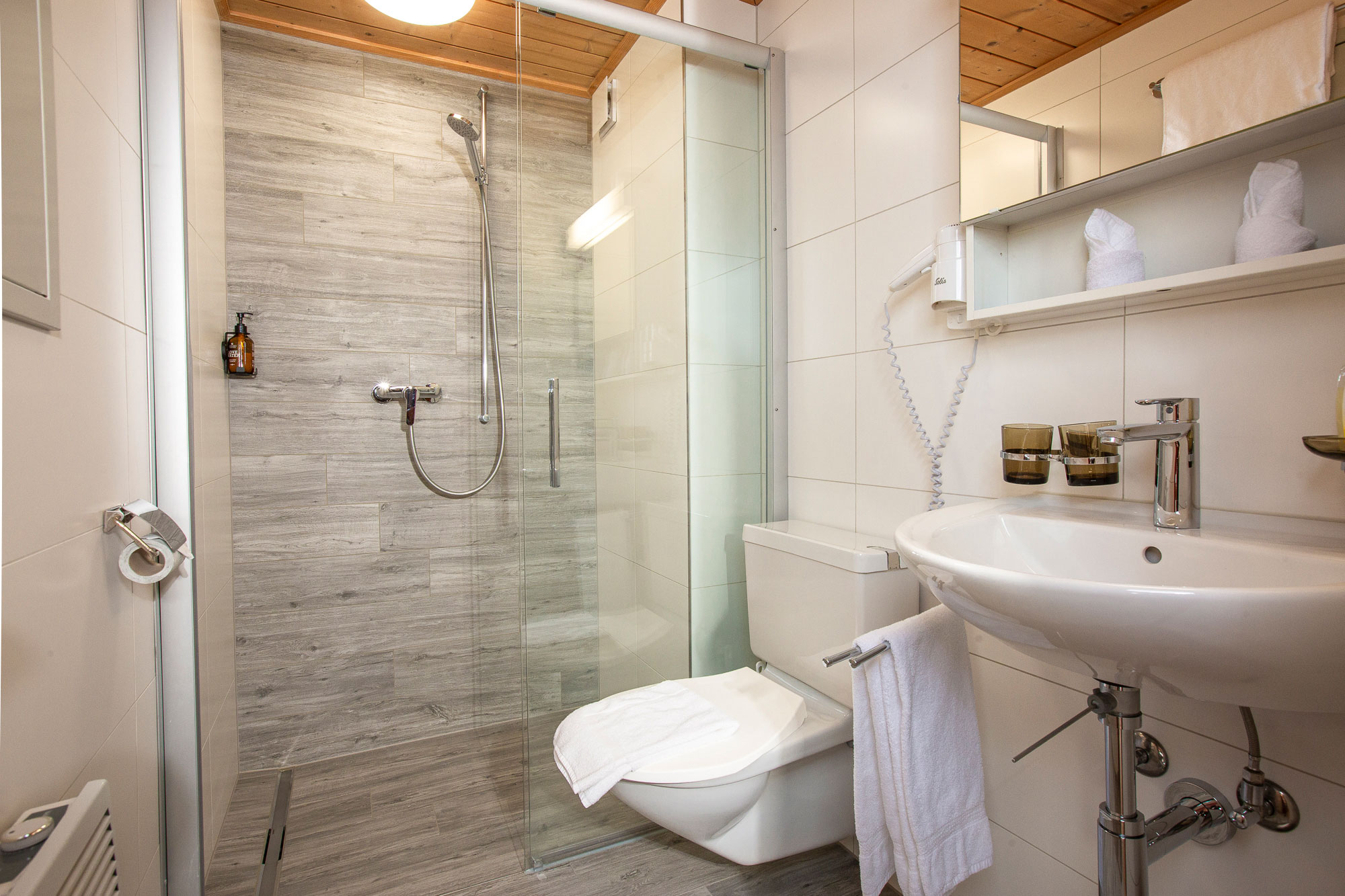 Zur Einzel und Doppelbelegung mit WC, dreieckiger Badewanne, Haarföhn und Beautyprodukten, Zustellbett oder Babybett