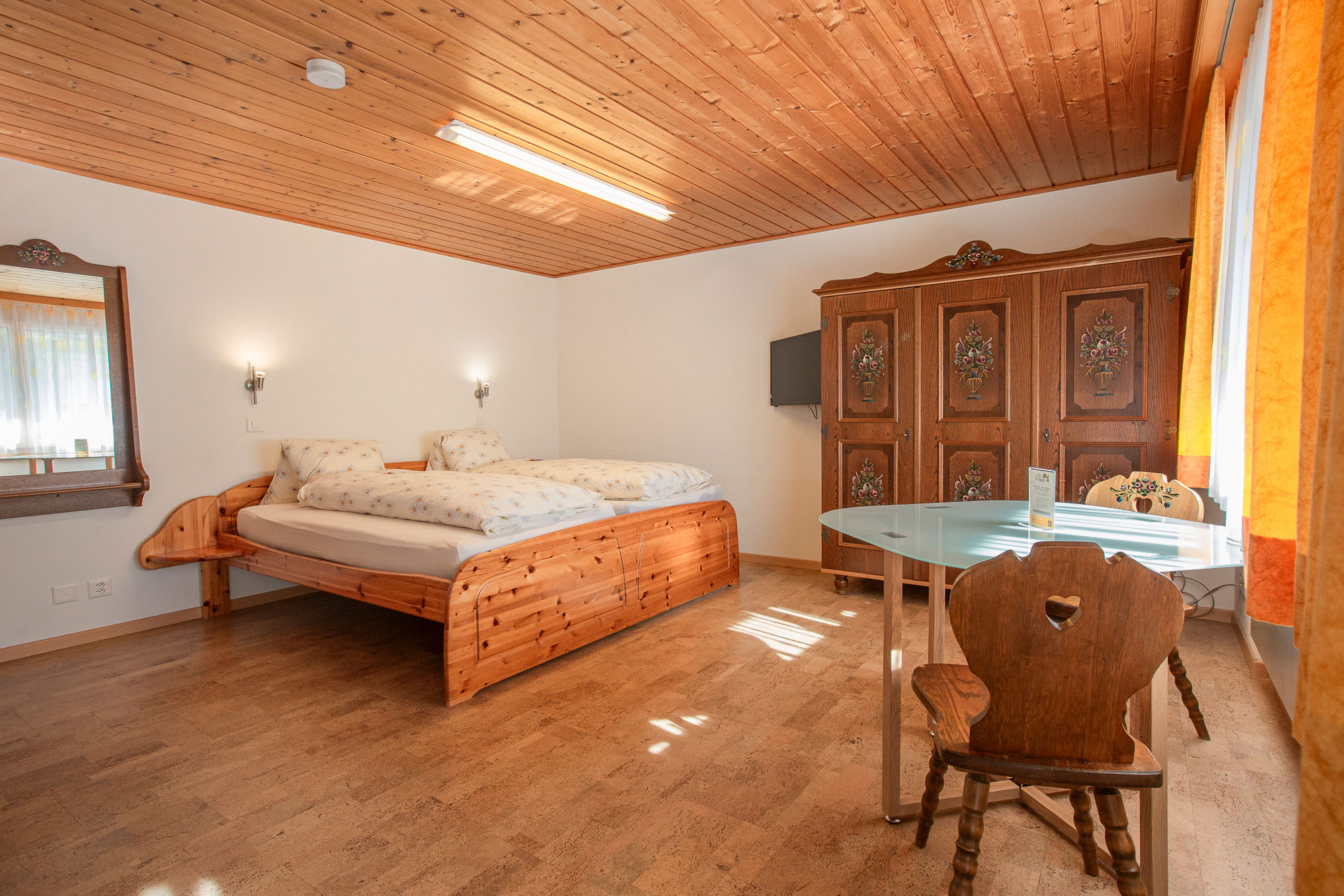 Im Landhausstil eingerichtetes 36m2 grosses Doppelzimmer mit Himmelbett, bemalt mit Bauernmalerei, Sitzmöglichkeit, Schreibtisch, Panoramabalkon mit Blick zu den Churfisten.